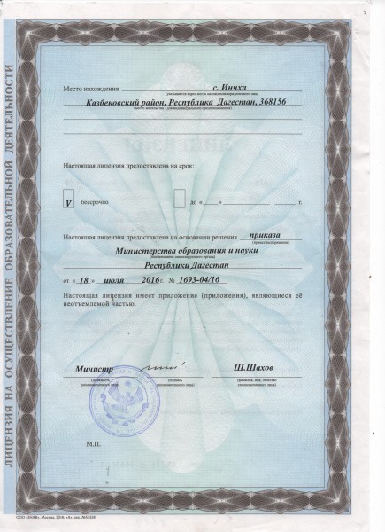 | Адрес местонахождения образовательной организации* | Казбековский район с.Инчха, 368156 ул Жаная |